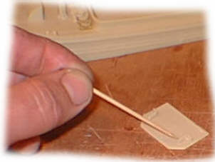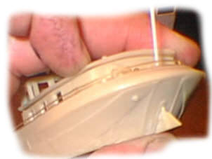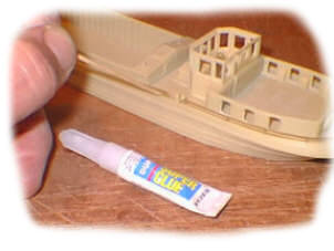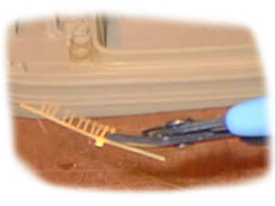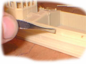 Ook de messing reling word op deze manier vast gelijmd. Als men direct het seconden lijm van uit de tube aanbrengt, dan komt er teveel lijm op en vloeit de reling dicht, wat men later goed ziet als het geverfd word. Op de daken worden ook nog een paar kleine onderdelen gelijmd, dit gaat dus op de zelfde manier. |