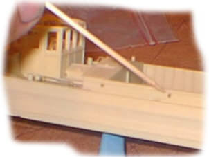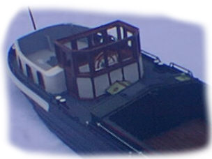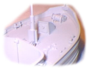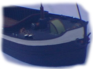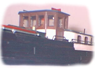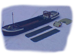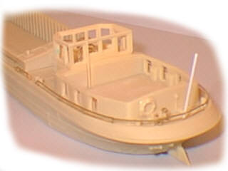 Uiteindelijk is het toch in de gewenste vorm gekomen, wat te zien is op de foto rechts. Dit word nu nog niet gelijmd, net als het dak van het stuurhuis en het laadruim. Het laadruim kan overigens naar keus open of gesloten gebouwd worden. Ik heb het nog open, want ik weet nog niet hoe ik het model op mijn trein tafel neerzet. Of in een haven waar het geladen word, of varende in een kanaal. |