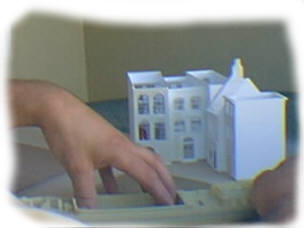 Dit proces neemt het meeste tijd in en bepaalt de passing van de onderdelen, dus dit klusje moet toch met veel geduld gedaan worden. Waneer alle onderdelen klaar zijn, controleer ik of het allemaal mooi past. Indien nodig moeten ze met schuurpapier of een sleutelvijltje bij gewerkt worden. Als men volgens de handleiding te werk gaat zal tijdens het schuren ook de openingen van ramen en deuren vrij gekomen zijn. Meestal moeten deze nog wat mooi gemaakt worden met een sleutelvijltje, bij sommige modellen kan dit ook later nog, bestudeer de tekening eerst. Hierna als alles mooi past was ik de onderdelen in een sopje schoon en tijdens het drogen kan de werk tafel ook opgeruimd worden, voornamelijk dat gietharsstof. Het lijmen gaat met secondenlijm. Ik begin door eerst de onderdelen tegen elkaar te houden, eventueel met plakband, maar meestal met mijn vingers. |