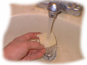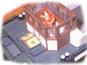 Het dak van het woon gedeelte moet verbogen worden. Dit kan men doen door het te verwarmen met heet water. Als het giet hars warm is buigt het gemakkelijk, maar ik vond het gauw terug buigen. Tijdens het maken van de foto had ik nog geen water in het was bakje, maar ik heb dat gevuld met heet water, waarna ik het onderdeel er een tijdje in onder stopte. |