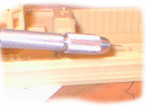 Hoe het giet hars bewerkt word heb ik reeds eerder omschreven, en met de volgende foto's laat ik het werken met de messing onderdelen zien. De messing onderdelen die hier toegepast zijn, zijn heel klein. Soms kan het nodig zijn om een gaatje schoon of groter te boren. Voor dit karwei heb ik een houder waar een dun boortje in past. De houder zelf is net zo klein als een kleine schroeven draaier. |