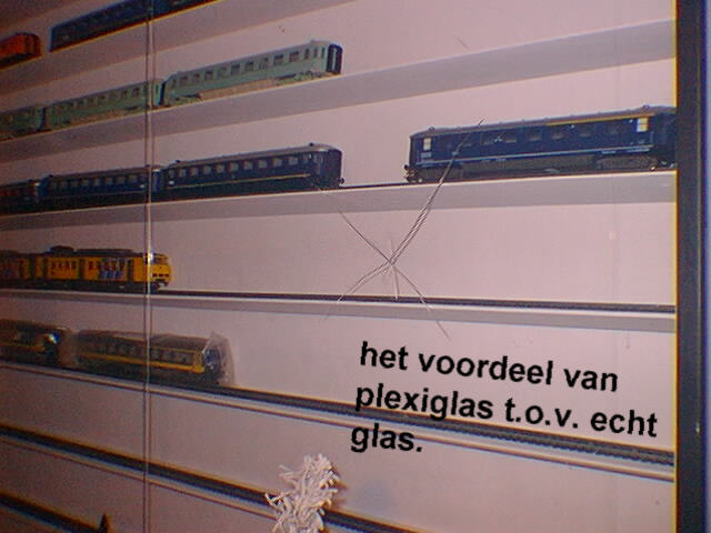 IK BEN NIET VERANTWOORDELIJK ALS UW VITRINE MET INHOUD VAN DE MUUR VALT, dit is Uw verantwoordeing, mocht het echter voorkomen, dat is echter bij mij nog niet gebeurd .kaboem ...even Apeldoorn bellen. Nu de vraag of we wel of niet rails gaan aanbrengen. Al mijn vitrines hebben rails, want ik zelf vind dat een trein op rails hoort te staan. Het is niet direct nodig, want het kan aardig in de kosten oplopen. Voor alle duidelijkheid, door trillingen gaan de wielen vrij vaak uit de rails, dus de treinen blijven er niet instaan. Bovenburen, spelende kinderen in 't huis? Als laatste het aan brengen van het glas. Echt glas is mooi, maar zwaar. Het mooiste is om het frame een 2 tal cm. Dieper te maken en hier een geleiding op te maken waar twee ramen in kunnen schuiven. Bij zwaar glas zal ik trouwens wel een stevige muur bevestiging maken. Ik zelf heb gekozen voor plexiglas, dit is licht en minder gevaarlijk tegen rond vliegende voorwerpen, van spelende kinderen (zie foto3).