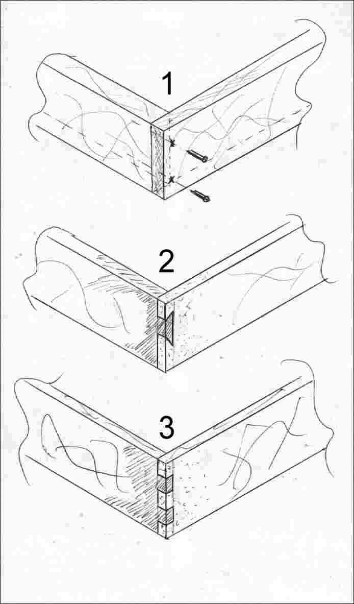 Dit artikel is ontstaan door een vraag in het forum van de Beneluxrail website over vitrines, met uiteindelijk de vraag om een "cursus" vitrines bouwen. Er zijn verschillende "vitrine bouwers" onder de leden en bezoekers van BENELUXRAIL.NET, en ik omschrijf hier dus mijn systeem. Andere "vitrine bouwers" worden bij deze aangemoedigd om hun systeem te omschrijven, waardoor de lezer alles kan vergelijken en zelf zijn ideeën op doen. Een ieder heeft zo tenslotte zijn eigen specifieke wensen / eisen. Jaren geleden ben ik begonnen met het verzamelen van treinen in de schaal HO. Het begon eigenlijk door het aanschaffen van zoveel materieel, dat niet meer op een kleine model baan past. Het is zonde om al dat mooi spul in de dozen opgeborgen te laten. Toen ben ik op het idee gekomen om vitrines te gaan bouwen, zodat vele uren besteed kunnen worden aan het bekijken van al dat moois. In het begin is een vitrine genoeg, maar al gauw word de collectie groter en heb je ook meer vitrines nodig. Het aanschaffen van kant en klaar gebouwde vitrines kan behoorlijk duur worden, dus zelf bouw is voor mij althans, de oplossing. Het vervaardigen van vitrines is niet moeilijk, het is voomamelijk het in elkaar zetten van een houten raamwerk, met balkjes waar de treinen op komen te staan. Mijn eerste vitrine had verlichting, en zelfs had ik een paar sporen van een spanning regelaar voorzien, waardoor de "Sprinter" op en neer kon "pendelen". Dit was ook bedoeld voor als er nieuw materieel aangeschaft was, om te testen of het wel rijdt. Het nadeel was het gewicht, in vergelijking met de afmetingen. Uiteindelijk was mijn collectie behoorlijk gegroeid, en had ik meer ruimte nodig. Ik heb nu 9 "lichte"vitrines gemaakt op een simpele manier, die ik hier gaat omschrijven. Ikzelf ben geen meubelmaker, of timmerman, maar gewoon een hobbyist, zoals de meesten onder ons. Als je een model baan kan maken, dan kan dit zeker geen problemen op leveren. Een professioneel zal het waarschijnlijk op een andere manier doen, maar mijn gebouwde vitrines voldoen aan mijn eisen, en zijn alweer meer als 10 jaar oud en nog steeds in goede staat, al denk ik wel later om het "glas" op een andere manier te bevestigen. Ik heb verschillende maten uitgekozen, want je hebt niet overal de ruimte aan de muur. Zo ga ik van een plaat triplex uit in de afmeting 122 x 244 cm. Deze heb ik in stukken van 122 x 122 en 66 x 122 gezaagd. Hierdoor heb je drie uitvoeringen, 1 een vierkant, 2 een liggend recht hoek, en 3 een staand rechthoek. Op deze manier kon ik zonder afval te hebben het meest er uit krijgen. Op een muur waar twee vierkanten niet past kan dus een staand rechthoek met een vierkant gecombineerd worden, op deze manier kan je, je hele huis bekleden, wel eerst even met je mede huisgenoten overleggen. Dan nu de bouw van mijn systeem. Enkele van mijn eisen voor een vitrine zijn het lichte gewicht,gemakkelijk hanteerbaar (ik verhuis nog al vaak, vanwege werk) en ik wil het simpel en goedkoop houden. Net als bij een pizza begin ik met de bodem. Deze is bij mij van een soort triplex, LUANN genoemd. Dit is ten eerste goedkoper maar ook stukken lichter dan gewoon triplex. Een plaat van 122 x 244 wordt eerst door midden gezaagd, en indien we rechthoekige vitrines maken nog een keer door de helft. De randen worden splinter vrij gemaakt en schoon geschuurd. Het raamwerk volgt nu. Ik ga in deze beschrijving verder met de bouw van een rechthoekige vitrine van 66 x 122 cm. De bouw is het zelfde voor de vierkante. Het raamwerk wordt gemaakt uit mooie rechthoekige latjes van 6 x 2 cm. De hoeken(zie schets1) zijn bij mij koud(1) aan elkaar bevestigd maar een andere, steviger manier is om de uiteinden in elkaar te laten komen door een soort vertanding(2-3). Door middel van hout lijm en schroeven, worden de latten met elkaar verbonden tot een frame. Dit frame is nu nog al slap, maar als het op de bodem gemonteerd word is dat verleden tijd. Het frame wordt aan de bodem bevestigd door middel van lijm en spijkers, net zoals de achterkant van een boekenkast. Doe eerst een spijker in de hoeken, en draai dan het geheel om en controleer of het frame haaks is. Meet diagonaal van hoek naar hoek. De twee diagonale afmetingen moeten gelijk zijn, om een rechthoek of vierkant te hebben, anders wordt het een parallellogram cq. ruit.