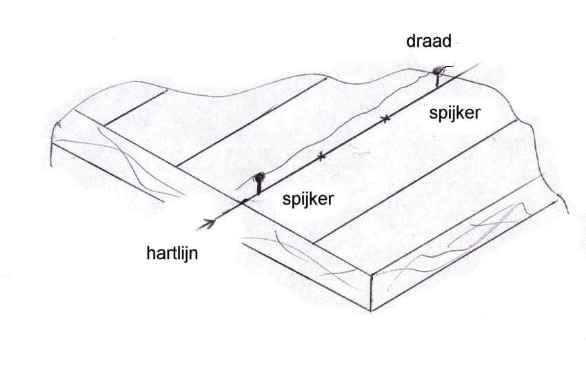 Door nu de "bak" weer om te draaien, dus de achterkant naar boven, spannen we een draadje touw of evt. een stroomdraad(zie schets 4), want dat hebben wij als model bouwers natuurlijk in voorraad, tussen de twee spijkers. Deze draad vormt de middel lijn waar we nu om de ongeveer 10 cm een kruisje tekenen en waar we dadelijk een spijker gaan slaan. De afstand tussen de latjes is ongeveer 10 cm. hart op hart, dus de open ruimte voor de treinen is dan ongeveer 10 cm - de dikte is 1,5 cm., dus ongeveer 8,5 cm. Dit is misschien het moeilijkste van het gehele project, we gaan de latjes er in bevestigen. We lijmen de latjes aan de bodem, en slaan van achteren een spijker door. Eentje aan de kopse kanten en eentje in het midden. We controleren nog even of het allemaal mooi in het midden is, en of er geen spijker perongeluk door het latje heen steekt, alvorens de andere spijkers er in te slaan. Na alle latjes op deze manier van achteren vast gemaakt te hebben, draaien we de bak weer om naar de bovenkant, en slaan een spijker door de buiten kant in de kop van ieder latje, dit uiteraard ook met houtlijm en dit zorgd voor een extra stevigheid en dat het latje haaks op de achterkant staat.
