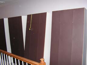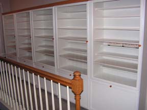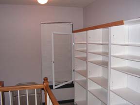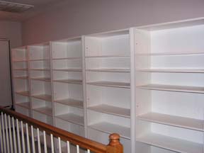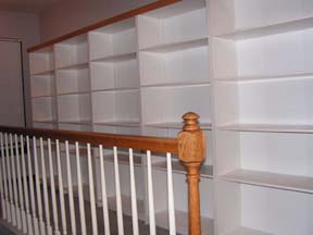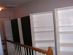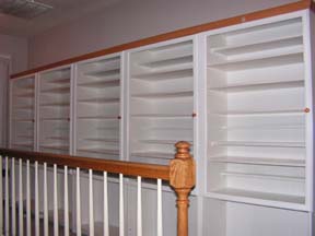 Het begin. Een vijftal witte boekenkasten die nooit een boek zullen zien. Afgewerkt met een klein sierlatje aan de bovenkant om in een geheel te komen met de trap leuning. | ![]() |