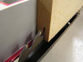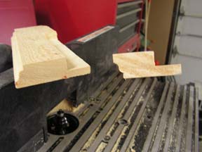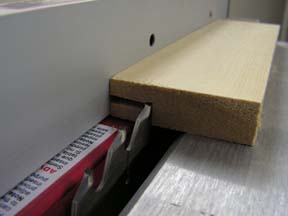 Nu draai ik het plankje om en zaag er nog een groef in waardoor er een hoek uit komt. Het verschil met het frame van het raam is dat er nu juist niet een paneel in geklemt word maar er van achter in geschroefd word. | ![]() |
