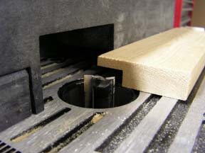 Op de freesmachine word het bijgewerkt waardoor het over de gehele lengte gelijk is. Om de foto beter te doen uitkomen heb ik het beschermkapje weg genomen. Uiteraard zonder deze beschermkap niet frezen. Ook goed op je vingers letten. | ![]() |