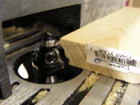 Met een andere frees word er een mooie afwerking aan het plankje gefreesd. Ook hier is de beschermkap verweiderd voor het maken van de foto. | ![]() |