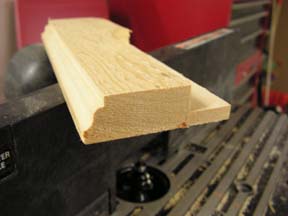 En hier het resultaat op een proef plankje. Echter ik had nog niet in de gaten dat ik een fout gemaakt had. Het gefreesde sier randje is aan de achterkant in plaats van de voorkant. Ik had namelijk al twee breede plankjes op deze manier gefreezd. | ![]() |