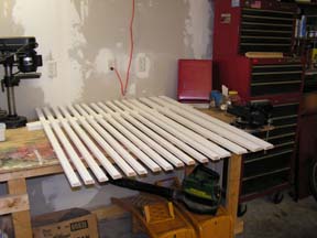 Inmiddels heb ik in de garage, mijn werkplaats is een beter benaming, de profielen klaar liggen voor de volgende vier ramen. Op deze foto zijn ze net geverfd en drogen ze. Later worden hier frames van gemaakt en zal het plasticglas er in schuiven. Het breedtste profiel is met een schroef aan de andere profielen bevestigd wanneer het plasticglas er in zit. Aan dit profiel worden later ook de scharnieren gemonteerd. | ![]() |