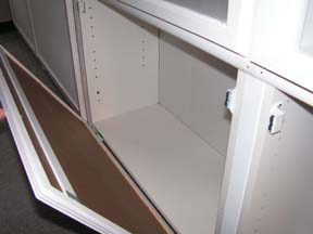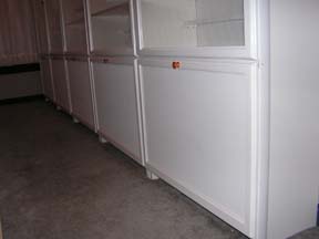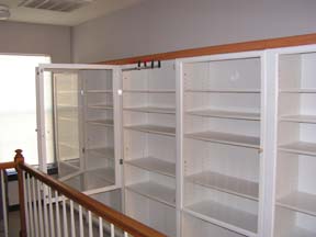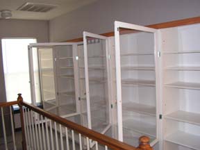 Ik zal dus nieuwe moeten gaan bouwen. Om ideen op te doen ben ik op het internet gaan surfen en heb ik in winkels gekeken hoe die hun koop waar uit stallen. Ik had al gauw besloten om vitrines te gaan maken met behulp van boekenkasten. De vijf boekenkasten waren al gauw gevonden en in elkaar gezet zoals het hoort, volgens de handleiding. Ze waren een voor een naast elkaar geplaatst, en dus nog niet aan elkaar gemonteerd.