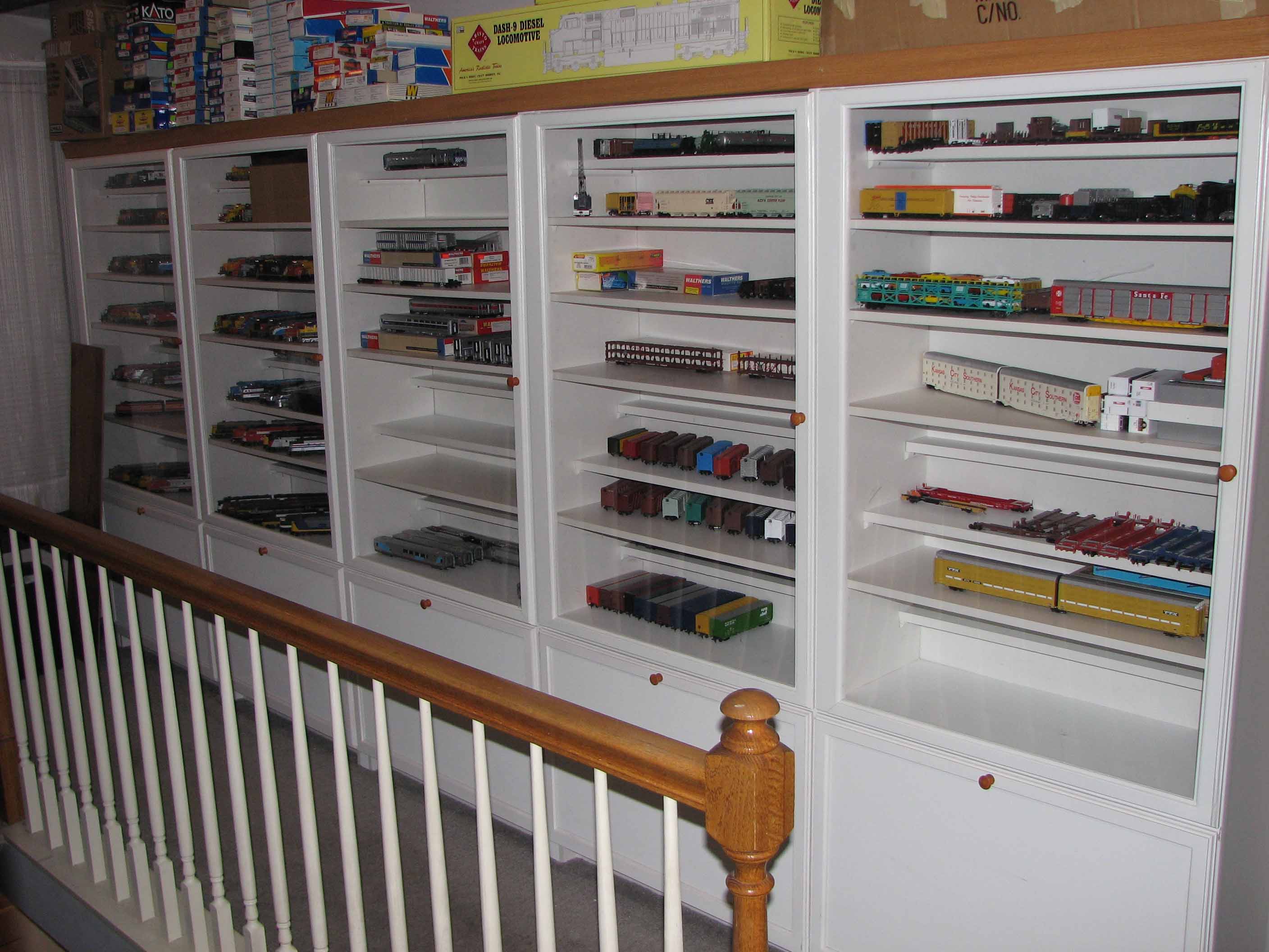 Ze zijn echter eerst gebruikt als boekenkast met mijn verzameling video banden. Ik was begonnen met het uit ruimen van de video banden, alvorens de boekenkasten te gaan ombouwen. Ik maakte echter de fout om de boekenkasten een tijd lang leeg te laten, tot dat ik op een dag thuis kwam van mijn werk en mijn vrouw alle vijf de boekenkasten gevuld had met wasgoed. Dus dan nog maar even wachten met die treinen uit te stallen.