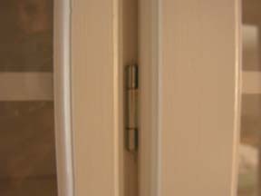 Hier een detail van het scharnier welke tussen de twee frame's in zit. Duidelijk is te zien dat het latje van het frame, welke de scharnieren draagt, breeder is. De kleur komt niet wit over maar als ik de flits van mijn camera gebruikte dan was het scharnier niet meer te zien en werd het een groot wit vlak. | ![]() |