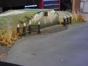 De scenerie is geverfd en klaar voor het strooimateriaal. Tevens is de buitenkant van de module in de zelfde kleur als de rest van de treintafel geschilderd om er als een geheel bij te passen. |